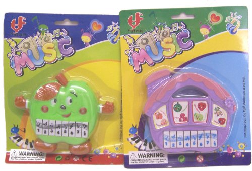 Assorted colors and shapes. Musical piano. For children ages 3 and up. Plays music and numbers. Takes 2 AA batteries. Case Pack 90